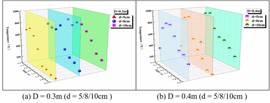 Figure 3 shows the temperature distribution on the axial centerline of the jet fire plume under the condition that the oil pool diameter is 0.4 m and the container inner diameter is 10 cm. After the jet flame becomes the quasi-steady state, it can be seen that the temperature distribution of the centerline of the jet fire plume present an obvious layered state. Audouin [34] uses the flame height to divide the flame area into a continuous flame area, an intermittent flame area and a buoyancy plume area. Combining flame height data of Figure 3 and Figure 4, it shows that the temperature distribution of the centerline of the jet fire plume conforms to the three-zone flame distribution theory.