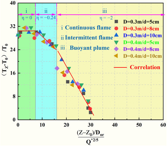 Due to the initial momentum of jet fire being different from that of oil pool fire, the dimensionless temperature distribution model cannot be directly based on the classic three-stage distribution model of the fire plume. It is necessary to introduce a virtual point source [27] to correct the temperature of the fire plume. The axial height is in the model. The virtual point source is used to illustrate the different buoyancy flux of the fire source. The virtual point source will change with the change of the buoyancy flux. Therefore, the virtual point source is used to correct the axial height, and the corrected height (Z−Z0) is brought into the Formula (2) to obtain the Formula (5).
