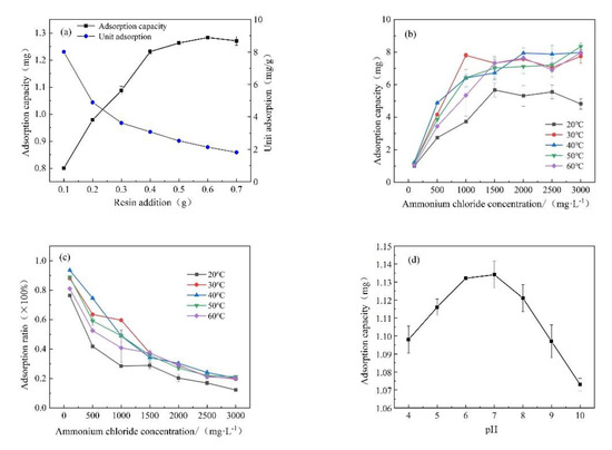 The effect of (a) resin addition on the ammonia nitrogen adsorption capacity, (b) the initial ammonia nitrogen concentration on the ammonia nitrogen adsorption capacity and (c) the ammonia nitrogen adsorption ratio, (d) pH and (e) time on the ammonia nitrogen adsorption capacity.