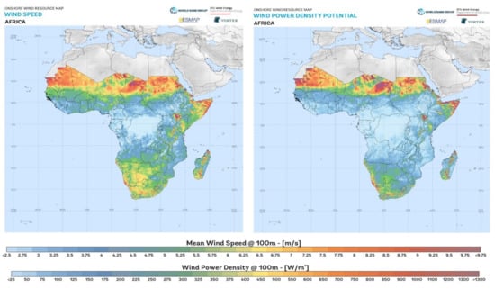 The wind speed and wind power density distributions of sub-Saharan Africa are shown in Figure 1 [21]; the dark red zones identify the highest wind power densities, followed by the red zone, the yellow zone, the green zone, the deep blue zone, while the light blue zones identify significantly lower wind potential. Here, one observes that some countries have sufficient wind power potential for it to become economically viable, but most of the continent has marginal and fair wind speeds and power densities. In addition, wind power is low and unsuitable in some areas. The lowest potential in sub-Sahara Africa is in Central Africa, while the highest potential is seen in Mauritania, Mali, Chad, Sudan, Niger, Somalia, Kenya, Namibia, South Africa, and the northeastern part of Madagascar. Mauritania’s potential, for example, is about four times its annual energy consumption in millions of tons of oil equivalent (MTOE), while Sudan’s is equivalent to 90% of its annual energy needs [22]. Mukasa et al., 2005, used a technical feasibility method based on technologies available and found these countries to have large on-shore wind energy potential [23].