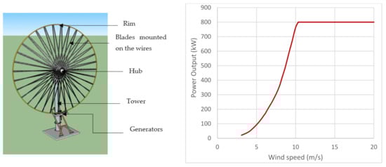 This research uses the Barber Wind Turbine (BWT), a commercial instantiation of FWT, as the basis for the techno-economic analysis of a low-speed wind turbine. Table 2 presents the geometry and technical specifications of the specific BWT used to explore the wind turbine design space. The BWT wind turbine is a 61 m (200 ft) rim with an 800 kW generator wind turbine (61 m–800 kW). This design is chosen because it is the initial wind turbine that BWT is commercializing; therefore, actual costs and data are available. The power curve of the BWT from wind tunnel testing is shown in Figure 4 and the data are presented in the Appendix A.