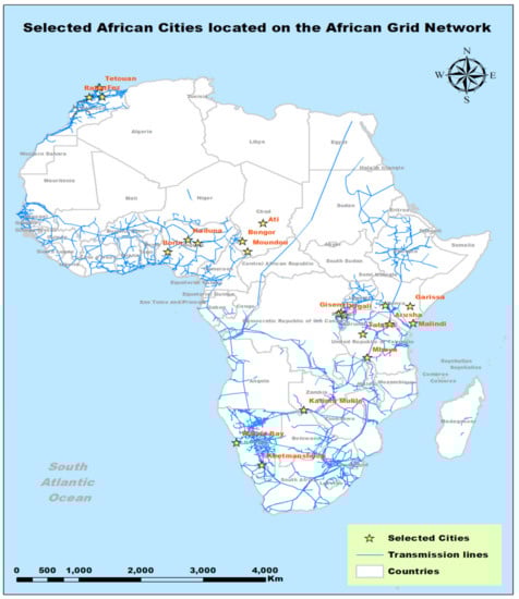 These African cities represent the range of wind speeds available in the continent from low to medium to high. The cities chosen also have significant populations. The windiest areas within the cities are chosen as installation sites. Figure 4 shows the locations of the cities and their proximity to the African electric grid network, which reduces the cost of transmission line installations to the sites [35,36]. Ati (Chad) and Garissa (Kenya) are not on the African grid network; these two locations serve as off-grid examples for this study.