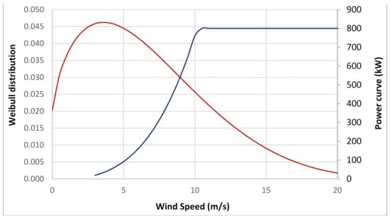 The Weibull parameters at measurement height are related to the parameters at the wind turbine hub height by Equation (3) [42,46,47],