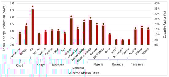 The model was developed and exercised in the selected African cities. A 61 m rim FWT with a rated power of 800 kW was selected for performance assessment and economic analysis. Hence, the annual energy produced, together with the capacity factors of the wind turbine for the selected locations, are indexes used for the performance assessment and are presented in Figure 6. The ROI, SPP, and LCOE of the wind turbines in the selected African cities are indexes used for the economic assessment and the results are presented and discussed in Figure 7, Figure 8 and Figure 9 and Table A3.