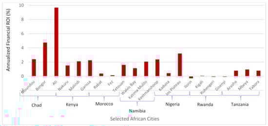 Using the appropriate equations and the assumptions and parameters presented above, the ROIs for siting the FWT in the selected cities were estimated. The results are presented in Figure 7. The annualized ROI ranged from −0.06% in Ruhengeri to 9.65 % in Tetouan. The wind turbine has a positive ROI value except for the cities Gisenyi, Ilorin, and Ruhengeri. Therefore, these cities are not economically viable locations for wind power generation using the FWT 61 m–800 kW design. Overall, the FWT wind turbine under study is economically viable in 18 out of 21 cities. Investors consider a business with a higher ROI more profitable than their counterparts with lower ROI. An annualized ROI of 2–6% is considered good value [69,70,71,72]. Therefore, 38% of the cities can generate an annualized ROI within this range and even more.
