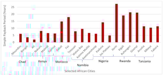 The estimated simple payback periods of the FWT in the twenty-one cities (Figure 8) show that the FWT will be able to pay for themselves within their lifetimes for the majority of the cities. The longest payback period of 27.3 years is observed at Ilorin, while the shortest payback period of 1.9 years is seen at Ati. Gisenyi, Ilorin, and Ruhengeri have payback periods that exceed the assumed lifetime of the wind turbine. Installing the wind turbines in those cities is not economically viable for energy production for the BWT 61 m–800 kW design. The payback period and ROI results agree, thereby validating the techno-economic model.
