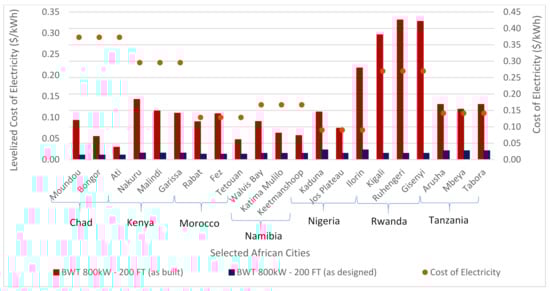 In Figure 9, we also compared the LCOE of the BWT as built to the LCOE as designed in the 21 selected cities. Ati has the lowest LCOE designed close to the LCOE as built by the manufacturer. Higher efficiency and energy capture is achievable in cities with better wind distribution than cities with lower wind distributions. In addition, the comparison of LCOE to the current cost of electricity (COE) rates is also shown in Figure 9. The LCOE is higher than the COE in most of the cities except for Moundou, Bongor, Ati, Nakuru, Malindi, Garissa, Tetouan, Katima Mulilo, Keetmanshoop, and Walvis Bay. Hence, 48% of the cities have lower LCOE values than the COE. The margins between the current COE and the LCOE results in Tetouan and Rabat are positive; therefore, the project is more profitable in these two cities than the rest of the cities. Moreover, the COE rates in different countries are fixed by the government and may have been subsidized by the government. The COE rates also vary depending on the application of electricity, as rates for industrial applications are generally higher than the household uses.