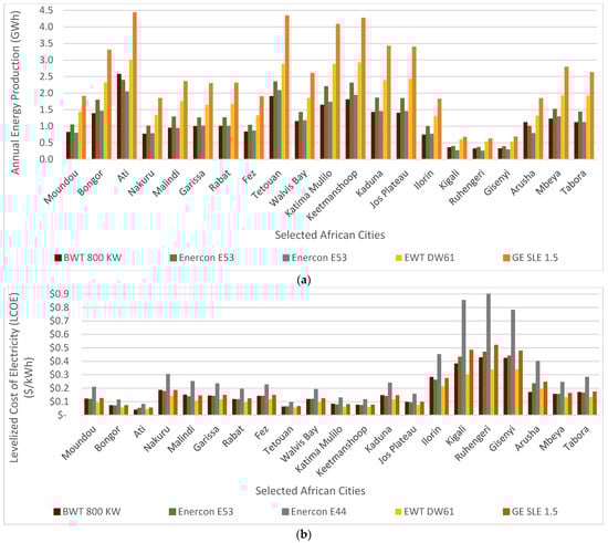 Using the technical specifications, the capital cost of acquisition and operation, and maintenance cost of the BWT and other existing wind turbines in the developed techno-economic model, the annual energy production (AEP) was estimated for the selected cities using their Weibull distribution. The results for AEP are presented in Figure 10a and Appendix A (Table A3). They show, for the 21 cities, that GE SLE 1.5 has the highest AEP, followed by EWT DW61, Enercon E53 and BWT 800, while Enercon E44 has the least AEP.