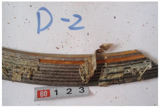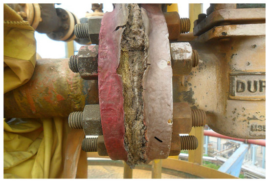 The leakage of the flange sealing surface is one of the typical failure modes for HF acid ALK unit. The typical flange leakage morphology and gasket corrosion leakage morphology are shown in Figure 4 and Figure 5. Subjected to the HF acid medium, the graphite composite layer of the gasket is easily peeled off. Due to the strong permeability of HF acid, the acid medium penetrates along the cracks of the graphite composite layer and contacts the metal skeleton of the gasket, which causes the sealing surface corrode. The fluoride layer can easily form in the HF acid condition. In addition, the thermal expansion coefficient of the fluoride layer is different from that of the metal, which results in further gaps in the sealing surface. Eventually, the leak will occur at flange sealing surface.