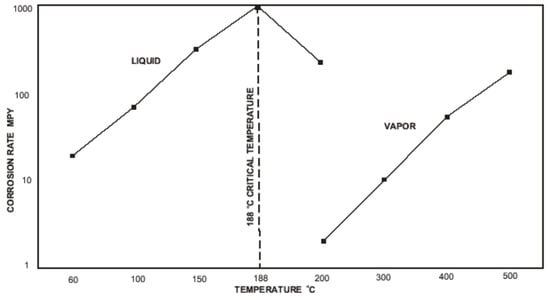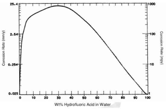 As can be seen from Figure 7, even in static anhydrous HF acid, when the temperature exceeds 66 °C, the corrosion rate already reaches 10 MPY (0.254 mm/a). If HF acid contains a certain amount of water, the corrosion rate of HF acid will be higher when the temperature is above 66 °C [16]. As can be seen from Figure 8, when the HF acid concentration.