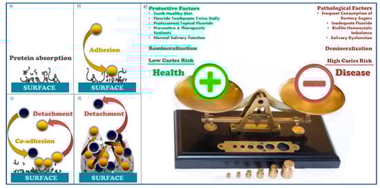 (a–d) Scheme of stages of bacterial biofilm formation: (a) adsorption of proteins forming a conditioning film; (b) adhesion of planktonic bacteria; (c) adhesion and detachment of planktonic bacteria; (d) growth and metabolism by adherent bacteria. (e) The dynamics of interactions between protective and pathological factors that can shift the balance in the oral cavity towards health or disease.