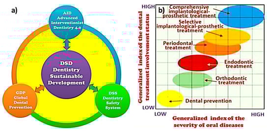 Diagram of the Dentistry Sustainable Development model (a), and an original concept of the matrix of advancement and treatment of oral diseases with the place of endodontics (b).
