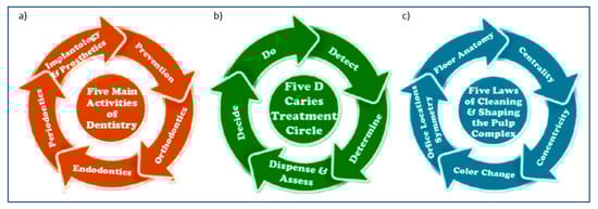 Diagram of the principles of the Fives: (a) Five Main Activities of Dentistry (5MAD); (b) Five D Caries Treatment Circle; (c) Five Laws of Cleaning and Shaping the Pulp Complex (5LCSPC).