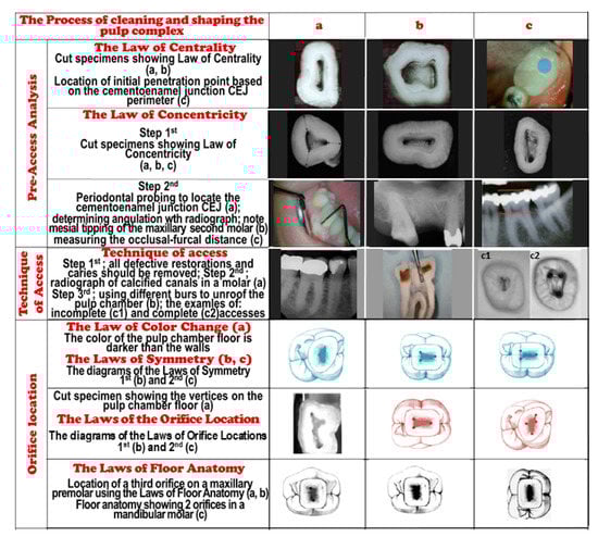Alternatively, the location of CEJ can be made using the law of concentricity [90] (Figure 4), which states that the outer contour of the tooth at the CEJ level is concentric with the walls of the pulp chamber. A tooth bulge or constriction directly and accordingly affects the expansion or constriction of the pulp chamber (Figure 4). The tooth’s angulation and a faciolingual direction can be determined by radiographic and CBCT studies, respectively (Figure 4). The radiograph also measures the distance between the furcation and the cusp tip and the cusp tip–pulp floor distance (CPFD). Directing the drill centrally concerning the CEJ and parallel to the long axis of the tooth with a length of bur in the handpiece correspondingly smaller than that of CPFD makes it possible to avoid chamber perforation in the furcation [91]. The shape of the hole contour, which may even fall out at the edge of the tooth, may be triangular, trapezoidal, or even irregular (Figure 4), and depends solely on the anatomical features of the pulp chamber [89].