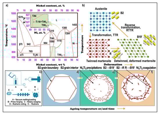 Diagram of information on nitinol alloys: (a) Ti–Ni phase equilibrium system; (b) diagram of phase transformations determining the shape memory and superelasticity effects; (c) diagram of the technological process of nitinol-type substances; (d) structure of austenite B2; (e) separation of Ni4Ti3 in the border zone of austenite B2; (f) coagulation processes of precipitates in the austenite border zone favouring the transformation of B2 → R and then R → B19′ with the B2 grain interior not changing the chemical composition, in which a one-stage martensitic transformation takes place (B2 → B19′).