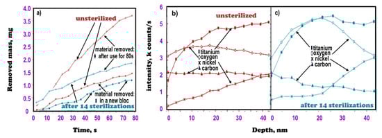 Properties of nitinol endodontic tools as delivered and after subsequent sterilization processes: (a) weight loss of the tool after drilling in a PMMA trial block with a simulated root canal used immediately after delivery or after repeated use for 80 s; (b,c) changes in the concentration of Ti, O, Ni, and C on the tool surface in the delivered condition (b) and after subsequent sterilization cycles (c).