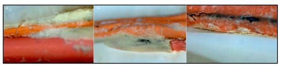 External factors, including bacterial, mechanical, thermal, electrical, and chemical factors, often cause pulp inflammation and necrosis [32,33]. Infection can also occur intrinsically due to metabolic disorders, nutritional deficiencies, anemia, or bacterial diseases, as well as the participation of blood vessels penetrating the pulp through the apical foramen [34]. Exposure of dentinal tubules may be caused by pathological factors, such as cavities of carious and non-carious origin, and by iatrogenic factors; i.e., caused unintentionally during medical procedures performed by a dentist. The most common extrinsic factors contributing to the development of pulp diseases are micro-organisms that penetrate through the exposed dentinal tubules from the tooth crown and the lateral tubules and apical opening from the side of the damaged connective tissue attachment [32,35]. The penetration of bacteria from the side of the chamber into the interior of the tooth may occur as a result of a deep carious lesion, marginal microleakage; i.e., a fissure appearing on the border of the filling and hard tooth tissues from the developing secondary caries, and as a result of non-carious defects, such as attrition, abrasion, or erosion. The micro-organisms present in the carious dentin defect are usually strict anaerobes such as Actinomyces, Bifidobacterium, Lactobacillus, Eubacterium, Propionibacterium, and Rothia, and less-frequent Gram-negative species and streptococci [36]. After reaching the pulp, the micro-organisms that penetrate the dentinal tubules cause an inflammatory process, leading to necrosis if left untreated. Due to the specific conditions in root canals with dead pulp, caused by low oxygen levels and a low redox potential, anaerobic bacteria, especially Bacteroides, Fusobacterium, Peptostreptococcus, and facultative anaerobes, mainly Streptococci, are colonized there [37]. Potential outbreaks of infection in the oral cavity include deep carious cavities; teeth treated with the amputation method with the mummified pulp left in the canals; teeth improperly treated with a root canal, including incomplete or overcrowded; chronic inflammatory processes in the periapical area or furcations of a granulation type; root cysts; germ cell cysts; periapical abscesses; periodontal abscesses; pathological periodontal pockets; and ulcerative lesions on the oral mucosa [38,39,40]. Pulp diseases can also be caused by acute or iatrogenic mechanical factors and thermal factors, most often caused by iatrogenic treatment, when the pulp temperature exceeds 42 °C, causing irreversible changes [41,42].