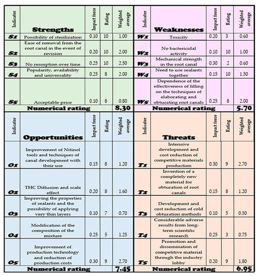 In the authors’ own work [70], the methods of matrix and scenario analysis, as well as the strengths–weaknesses–opportunities–threat (SWOT) analysis, were also used. The described methodology was used in the experimental studies described in the second part of the work in order to demonstrate the assumed thesis about the usefulness of the filling material based on gutta-percha and the practical use of these methods.
