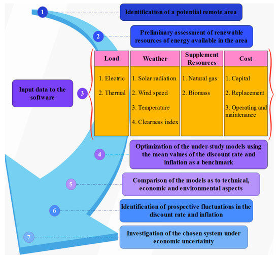 The main contribution of this study is that the proposed approach to optimal unit sizing of an HRE system to be applied in remote rural areas under economic uncertainty, which is inherent mostly in under-developed countries, can be deployed by other similar nations with islands and far-off villages. Additionally, a rigorous survey of literature has indicated that the the impact of economic uncertainty on optimal unit sizing of HRE systems has not been explored, which means this work could be a marked contribution to the field. Thus, interested researchers can undertake the approach of this study (Figure 2) as a guideline to scrutinize the potential of electricity and heat co-generation in the nominated regions, as well as to optimally size the units when economy is volatile. The benefits of such a scheme include (I) making the remote places self-sufficient in energy generation, (II) decentralizing electricity coverage, and finally (III) accelerating decarbonization of energy sector set to meet the Paris Agreement targets.