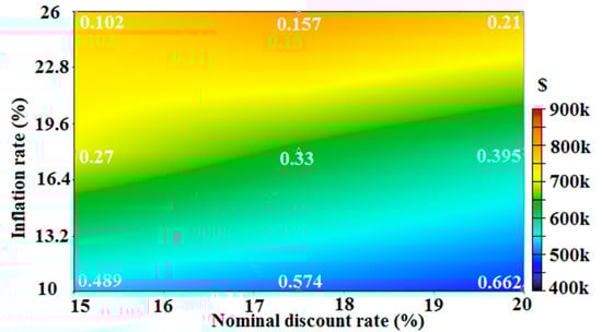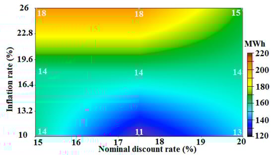As mentioned, predicting the future value of money in underdeveloped countries may be onerous due to the high fluctuations in the discount rate and inflation. Hence, to obtain the most likely results as to the economics of PV/WT/electrolyzer/H2-based FC/H2-based boiler system, the least and the highest prospective amounts of these rates were incorporated into the projections. To this end, the nominal discount rate and inflation were considered to vary in the range of 15–20% and 10–26%, respectively, based on the 20-year average from mid-2000 to mid-2020.
