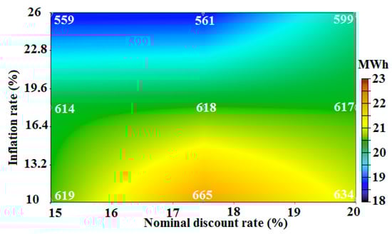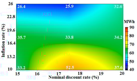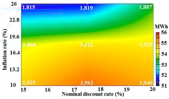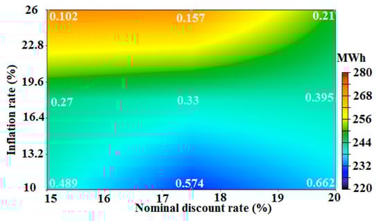 Changes of annual electric production considering the fluctuations of the nominal discount rate and inflation (Numbers inside the surface plot refer to LCOE).