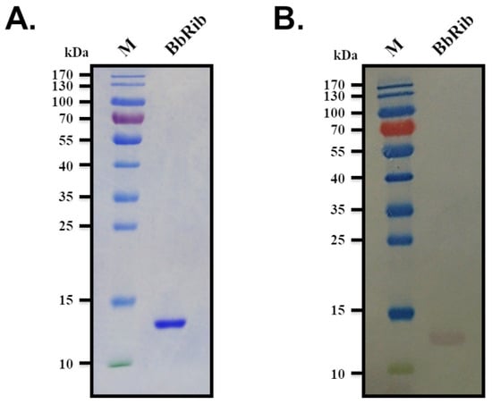 SDS-PAGE analysis and Western blot verification of purified BbRib. (A) SDS-PAGE analysis of purified BbRib protein. (B) Western blot verification. M, Prestained Protein Ladder (Thermo Fisher Scientific); Lane BbRib, purified BbRib protein.