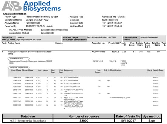 To further verify the sequence correctness of the recombinant BbRib protein, we used a clean scalpel blade to tap the single protein band in the gel stained with Coomassie Brilliant Blue according to the identification results of SDS-PAGE gel electrophoresis analysis and Western blot. In addition, we entrusted Shanghai Applied Protein Technology Co. Ltd. (Shanghai, China) to perform mass spectrometric identification of the samples. MALDI-TOF was used to analyze the proteolysis products by MS1 and MS2 mass spectrometry. The qualitative information of the protein was finally obtained by collecting peptide molecules and their fragments and then matching the database software. Based on the identification results provided by APT, the purified BbRib protein was identical to the wild-type B. bassiana (Beauveria bassiana ARSEF 2860) Ribonuclease/Ribotoxin (XP_008594335.1) amino acid sequence provided by NCBI, and the identification is correct (Figure 2).