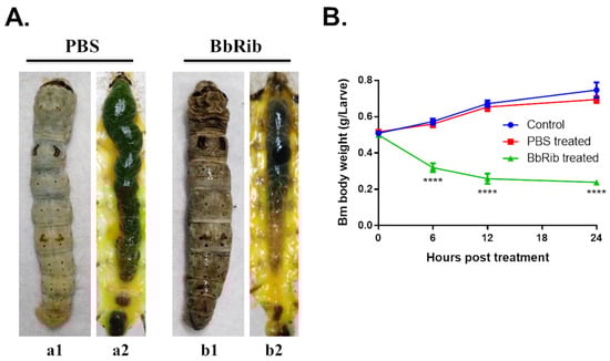 Morphological changes of silkworms after BbRib treatment via hemocoel injection. (A) Silkworm larvae were treated with purified BbRib (25 μg/larva) or PBS buffer (control group). Dead insects were removed and dissected to observe tissues and organs in the haemocoel. a1 and a2, morphological changes and pathological anatomy of PBS buffer control group; b1 and b2, morphological changes and pathological anatomy of BbRib protein treatment group. (B) Effect of BbRib on the weight of silkworm larvae after haemocoel injection. Average body weights of fifth-instar silkworm larvae were measured and recorded after BbRib treatment and compared with PBS control group at 6, 12 and 24 h, respectively. ****, p < 0.0001.