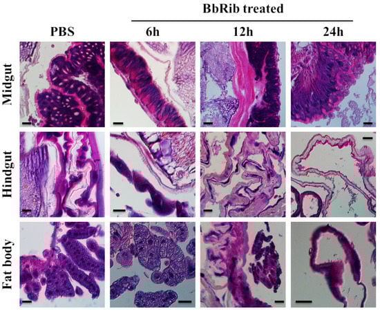 Histopathological changes and microscopic observation of silkworm larvae after BbRib treatment. Silkworm larvae were treated with purified BbRib (25 μg/larva) or PBS buffer (control group). Silkworm tissues (midgut, hindgut and fat body) were sampled using paraffin sections and subjected to hematoxylin-eosin (HE) staining. The histopathological changes of samples were compared and analyzed by microscopic observation.