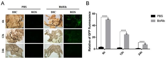 We also dissected silkworm larvae with BbRib protein injected into the haemocoel at different time points (6, 12 and 24 h) and analyzed the level of reactive oxygen species (ROS) in the fat body tissue (Figure 5). If sampling is performed 6 h after injection of BbRib protein, a strong green fluorescence signal was observed under a fluorescence microscope compared with the PBS control group. At 12 h after injection, the fluorescence intensity of the BbRib protein treatment group was weaker than the 6-h result, but it was still significantly higher than that of the control group. At 24 h after the injection, the BbRib protein treatment group was similar to the control group, and almost no green fluorescence was detected. These results indicate that the purified BbRib protein can quickly activate the ROS stress response in the fat body tissues and cells of the larvae after being injected into the blood cavity, but its activity gradually decreases as the injection time increases, and the degree of insect poisoning increases. We speculate that the ROS oxidative stress response is mainly involved in the detoxification process in the body during the early stage of poisoning, but the effect is not obvious in the later stages.