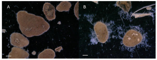 Micrographs of large granules (>1 mm): (A) on 23 January 2019 (normal operation); and (B) on 9 July 2019 (at the end of the test period). Size bar: 0.5 mm.