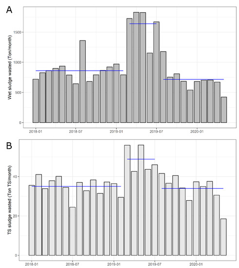 Monthly waste sludge production. (A) Tons of wet sludge produced (B) Tons of TS produced, based on the measured TS content of the waste sludge (40 g/L during normal operation and 31 g/L during the test period). The blue lines indicate the average sludge production in the periods before, during and after the test period.