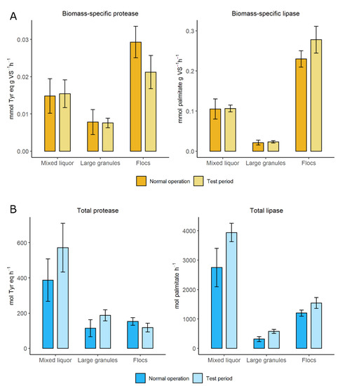 From the enzyme activities measured, none was detected in the bulk liquid. All lipase and protease activity were associated to the biomass, both to granules and to flocs. This observation is in line with previous biofilm and activated sludge studies that found hydrolytic activity to be predominantly associated to the biomass [13,17,43]. Flocs had higher specific lipase and protease activity than granules, as observed in WWTP Garmerwolde [31], most markedly in the case of lipase. The increased particulate load period had an effect on the biomass-specific activities of flocs, with a decrease in protease activity and an increase in lipase activity. This could be related to the increased influent lipid concentration in the test period, whereas the protein concentration did not change as sharply. That only the biomass-specific hydrolytic activities of flocs changed over the test period indicates that floc activity is more rapidly influenced by changes in the influent than granules. Furthermore, it seems from our results that flocculent sludge is actively involved in lipid hydrolysis and can increase the production of enzymes during a higher exposure to lipid substrates.