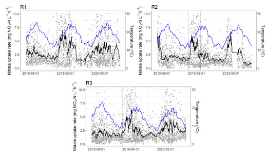 Denitrification rates measured during the post-denitrification period. R1, R2 and R3 indicate Nereda® reactors R1, R2 and R3 of WWTP Epe. Each dot represents the average rate in one SBR cycle. The continuous black line represents the moving average, with a sliding window of 7 days. The blue line indicates the temperature in the reactors. The test period is delimited by dashes.