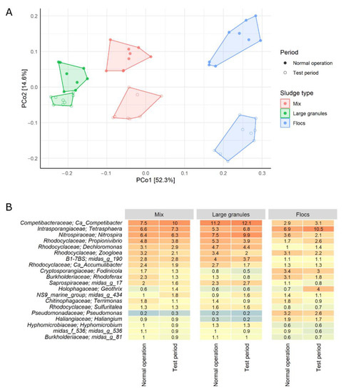 The microbial community of the mixed liquor, large granules and flocs differed significantly, in terms of beta-diversity (p = 0.001). Significant differences were observed too between the samples taken during normal operation and during the test period. The shift in microbial composition during the test period was most pronounced in flocculent sludge, and less in large granules. The distances between the analysed samples are presented in Figure 5A.