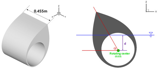 A series of CFD simulations were conducted to investigate wave-induced non-linear motion with respect to wave heights. Figure 1 shows the shape of an asymmetric rotor model with a scale ratio of 1/11, which was used for the experimental study in [22]. In addition, the origin of the body-fixed coordinate system is the rotating center, and y = 0 is half the width. The prototype of the model was optimized with a target wave height of 2.0 m and wave period of 5.1 s, which was the wave condition for Jeju, a western sea of South Korea. The principal dimensions of the rotor model are summarized in Table 1. The beak angle and draft of the rotor model are 60° and 0.17 m, respectively. In addition, the vertical distance between the free surface and the rotating center of the rotor model is 1.6 m. The rotor model has a hole at the center of the rotating axis to reduce manufacturing costs. In this study, the rotor model is assumed to be installed on a fixed large platform; hence, the other directional motions excluding the pitch motion are fixed. To understand the non-linear pitch motion characteristics, PTO damping was not considered in this study. Each of the CFD simulation results, which are calculated for the model scale, are expressed in full-scale for this study.