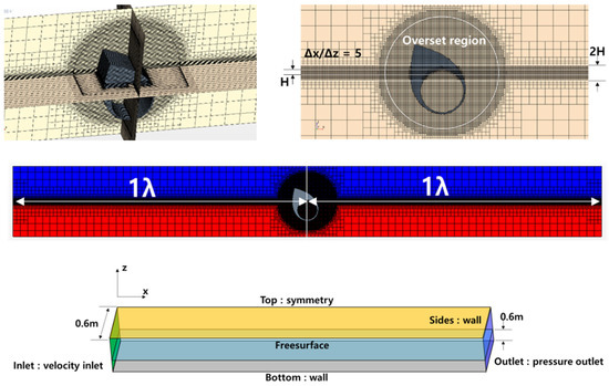 To decrease the number of grids, the forcing method was applied in the CFD simulations. Therefore, the domain length was determined to be equal to the wavelength. In this study, the grid size was determined using [23]. The upper figures in Figure 2 show the grid systems. Two refinement zones in the fluid domain and one refinement zone in the overset region were adopted around the wave region and model region. The heights of the refinement zones for the wave region were set as one time and two times the wave amplitude. The refinement zone size in the overset region was set to be equal to the one-time refinement zone size of the wave amplitude. To accurately generate the regular wave, a grid aspect ratio of 5 was applied in the wave region. In the CFDs, the prism layer for the viscous sub-layer is excluded because the viscosity of the fluid is less important in the body motion problem. The boundary conditions were as follows: the velocity inlet boundary condition was applied to the inlet part, pressure outlet boundary condition for the outlet part, and symmetry condition for the top part, and wall boundary conditions were applied to the sides, bottom, and rotor model surfaces. In addition, the total number of grids was 0.57 million.