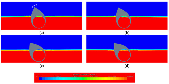 Snapshots of the side view for the numerical simulation (T = 5.10 s, H = 0.11 m): (a) Phase = 0/3 π; (b) phase = 1/3 π; (c) phase = 2/3 π; (d) phase = 3/3 π.