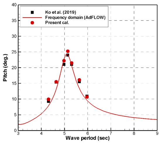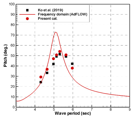 The pitch magnitudes from the CFD simulations were directly compared with those of the experimental and frequency domain analysis results, as shown in Figure 10. The maximum error between the CFD simulation and experimental results according to the wave periods is about 5%. The frequency domain simulation result is different from the experimental and CFD results, excluding the pitch motions in relatively short-wave periods (4.25 s and 4.60 s). In the case of the pitch motions in relatively short-wave periods, the pitch motions show linear responses, as shown in Figure 9a. At this wave height, it can be seen that maximum pitch motion occurs in a wave period of 5.30 s. This is because the secondary moment of the water plane might have changed owing to the asymmetry shape of the rotor. In the case of the frequency domain simulation, the change in the secondary moment of the water plane cannot be considered. In addition, the pitch magnitudes near the wave period of 5.30 s decreased as the viscous damping increased at this wave height.