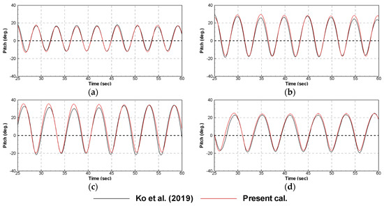Comparison for the time histories of the pitch motions between the experimental and numerical simulation results (H = 0.33 m): (a) T = 4.25 s; (b) T = 5.00 s; (c) T = 5.30 s; (d) T = 6.00 s.