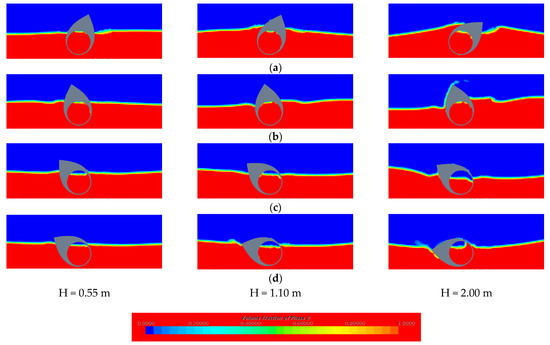 In this study, CFD simulations were performed at relatively higher wave heights. Figure 11 shows snapshots from the CFD results according to the wave heights at T = 5.10 s. The pitch motions increase with increasing wave heights, and non-linear phenomena, such as wave runup and slamming phenomena, occur on the rotor surface from a wave height of 1.10 m, as shown in Figure 11b,c and Figure 12. Figure 13 shows the representative time histories of the pitch motions of the rotor at three wave heights under representative wave periods. The differences between the positive and negative amplitudes of the pitch motions gradually increase with increasing wave height. This means that the restoring moments between the positive and negative directions can be different.