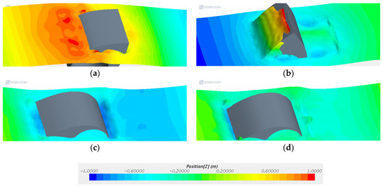 Snapshots of the side view for the numerical simulation (T = 5.10 s): (a) Phase = 0/3 π; (b) phase = 1/3 π; (c) phase = 2/3 π; (d) phase = 3/3 π.