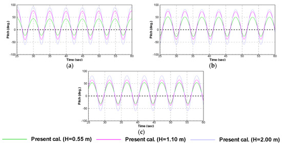 Comparison of the time histories of pitch motions in several wave heights and wave periods: (a) T = 5.00 s; (b) T = 5.10 s; (c) T = 5.30 s.