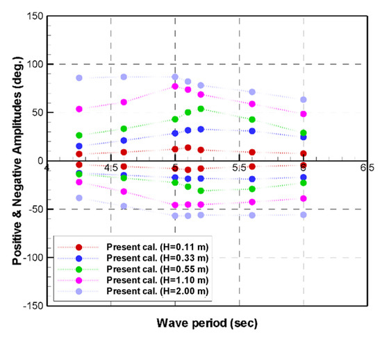 Figure 14 shows the summarized maximum amplitudes of the pitch motions in the positive and negative directions from the CFD results. The maximum amplitudes of the pitch motions in each wave condition are the average values for five periods in the pitch time histories. In the case of wave heights of 0.11 m, the differences between the maximum amplitudes of the pitch motions in the positive and negative directions appear to be relatively small in all wave periods; the maximum difference is approximately 4 deg. In addition, their differences gradually increase as the wave height increases.