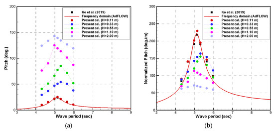 In the case of the wave heights of 1.10 m and 2.00 m, it was difficult to apply the pitch motion equation owing to the slamming phenomena, as shown in Figure 12b,c. Figure 18 shows the added moments of inertia and radiation damping from the forced motion simulations. The results of the CFD simulation and frequency domain analysis were directly compared with each other. It can be seen that the added moments of inertia and radiation damping from the CFD simulations are similar to the frequency domain analysis results. Therefore, the inertia and damping terms of the pitch motion equation would have minimal effect on the change in the normalized pitch motions.