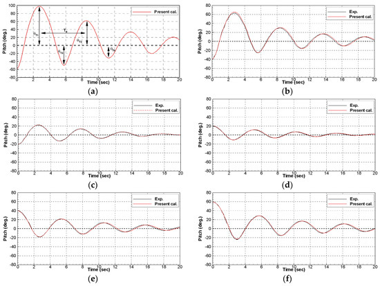 Comparison of the time histories between the experimental and numerical results for free-decay tests: (a) Initial angle = −60 deg.; (b) initial angle = −40 deg.; (c) initial angle = −20 deg.; (d) initial angle = 20 deg.; (e) initial angle = 40 deg.; (f) initial angle = 60 deg.