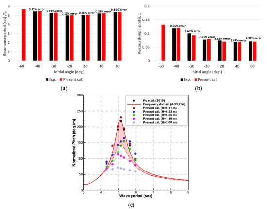 Comparison of the resonance period, and the viscous damping ratios between the experimental and numerical results for free-decay tests: (a) Resonance period; (b) viscous damping ratio; (c) normalized pitch motion when applying the largest viscous damping.
