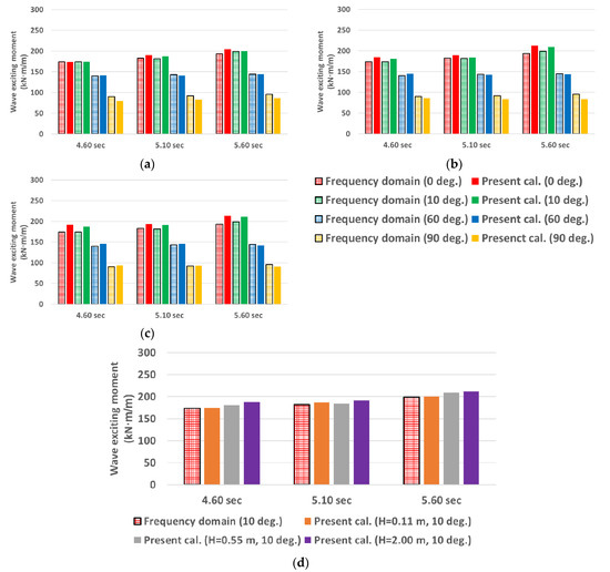 Comparison of the wave exciting moments by the fixed body simulations: (a) H = 0.11 m; (b) H = 0.55 m; (c) H = 2.00 m; (d) wave exciting moments at a pitch angle of 10 deg.