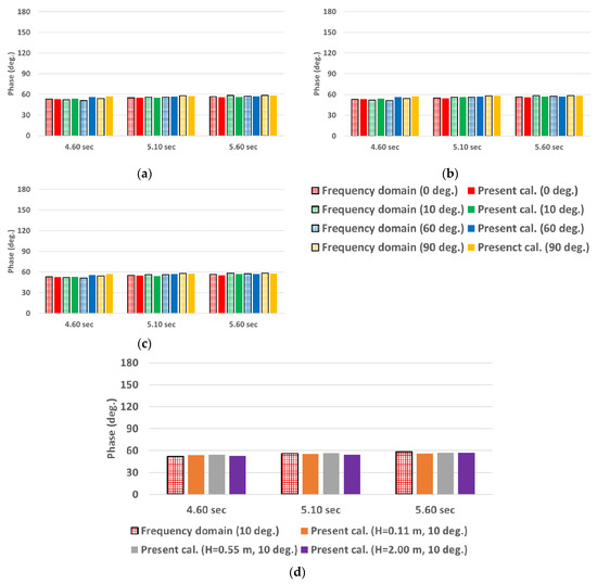 Comparison of the phase angles by the fixed body simulations: (a) H = 0.11 m; (b) H = 0.55 m; (c) H = 2.00 m; (d) phase angles at a pitch angle of 10 deg.