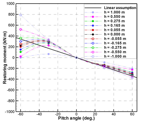In this study, the restoring moments were investigated depending on the changes in the relative water depths (h) and pitch angles, as shown in Figure 21. The restoring moments can change with the pitch angles, and the restoring moments can also change with the relative water depths, which are caused by the wave heights of the incoming waves with a rotating rotor. However, changes in the relative water depths due to the ever-changing wave elevations and pitch angles of the rotor are difficult to consider in order to estimate the restoring moments. Therefore, the relative water depths were assumed based on the crests and troughs of the incoming waves in the static condition, and the restoring moments were estimated according to the pitch angles at each water depth. The calculated restoring moments are compared with the results from the linear assumption. In the case of the linear assumption, the restoring moments change linearly according to the pitch angles. However, owing to the changes in the secondary moment of the water plane, the restoring moments of the rotor change depending on the relative water depths and pitch angles. Therefore, the variations of the restoring moments in the motion equation should be considered to estimate the pitch motions. In [19], the author performed a time-domain analysis and modified normalized pitch motions according to wave heights ranging from 0.02 m to 0.08 m by changing the restoring moments. The experimental and time-domain simulation results were similar to each other at relatively low wave heights. In the case of higher wave height conditions, the resonance periods of the rotor and magnitudes of normalized pitch motions between the experimental and time-domain simulation results were different. Regarding the difference between the experimental and time-domain results in higher wave conditions, research in [19] noted that the differences could occur due to a slamming effect and viscous effect.